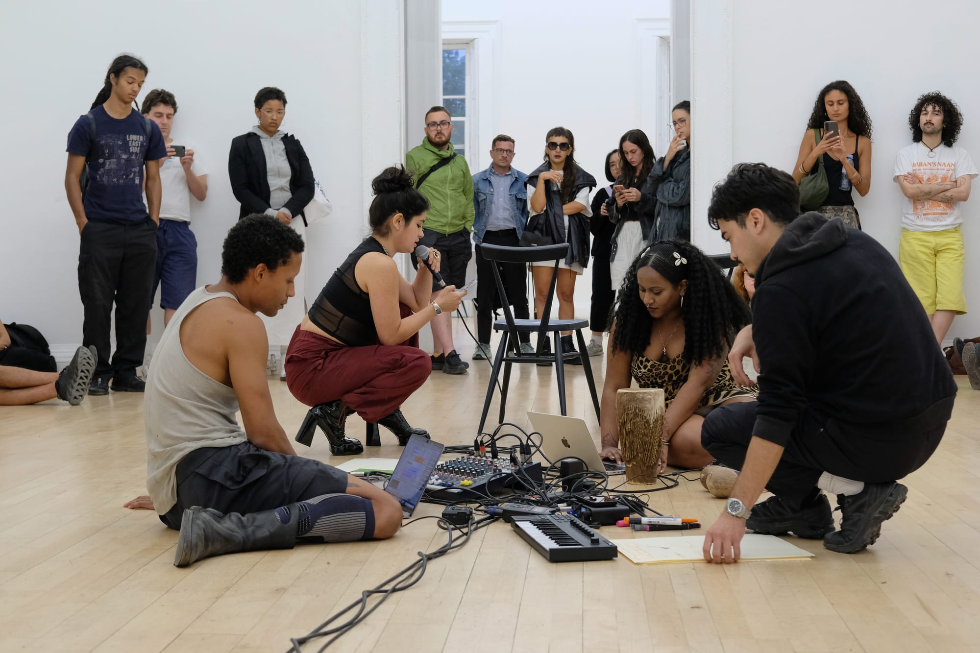 This is something the collective put into action last summer in 2025, with their debut collaborative project ‘Sounding Futures,’ at the renowned Institute of Contemporary Arts (ICA) called for. Diasporas Now’s ICA resident artists and collaborator Joshua Woolford were working remotely at the time across continents, were able to research and develop a performance from conception to execution - from choreography to songwriting and composition, to dramaturgy and scripts for spoken word while also bringing in special guests like cellist Abi Asisa and set designer Furmaan Ahmed. They came together in person for two days, helped build the set as a team, and rehearsed in the ICA theatre before showcasing the end result to a public audience. While they performed, they documented the process by filming one another, projecting the footage live on stage; creating an archive of the performance in real time. Both the performance and the panel talk that followed invited audiences to think beyond the usual parameters of performance art, not just the finished outcome, but the process of collaborative making as central to the work itself. They allow space to deconstruct, analyse, and champion more collaborative methods in the art world, in an ecosystem that can often default to individualism.